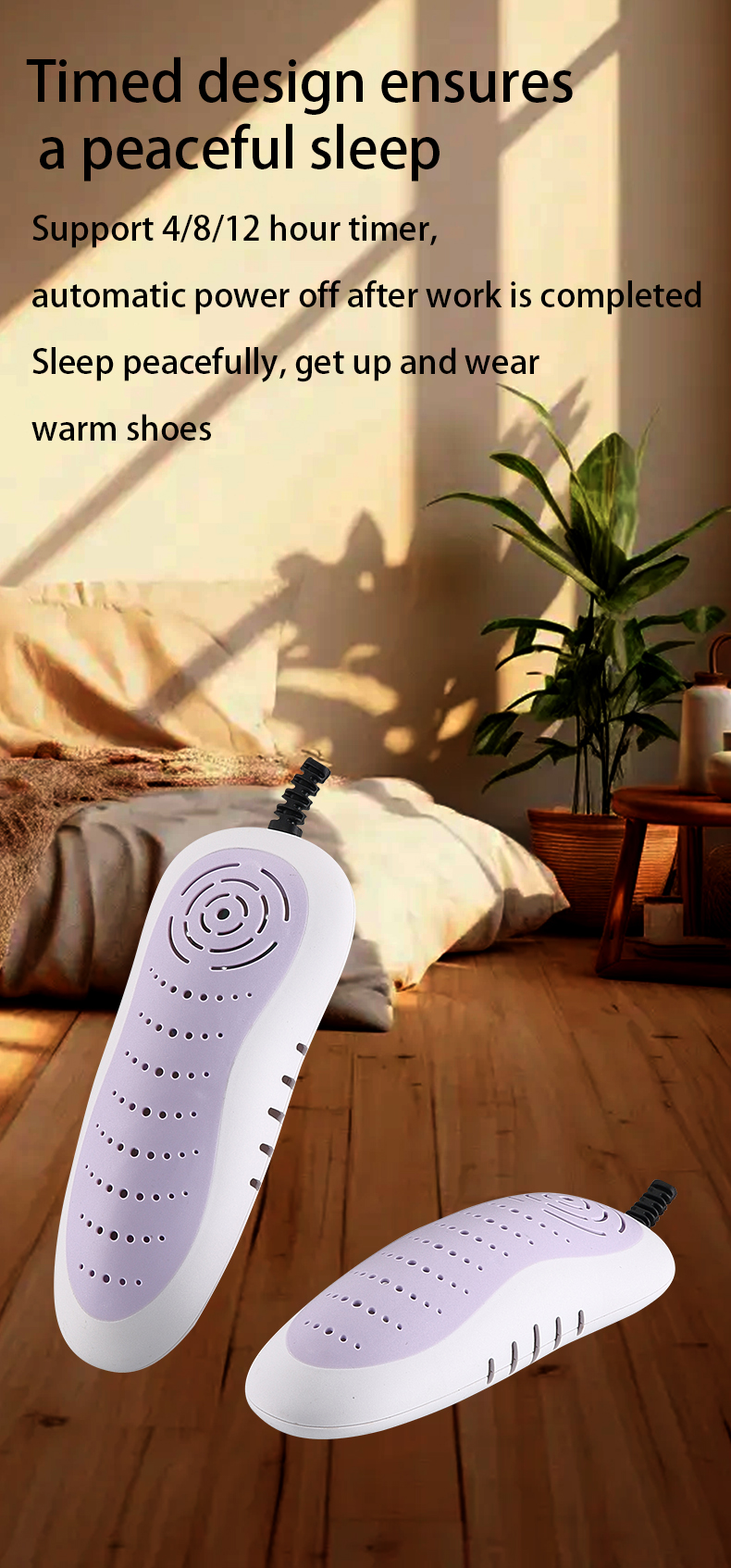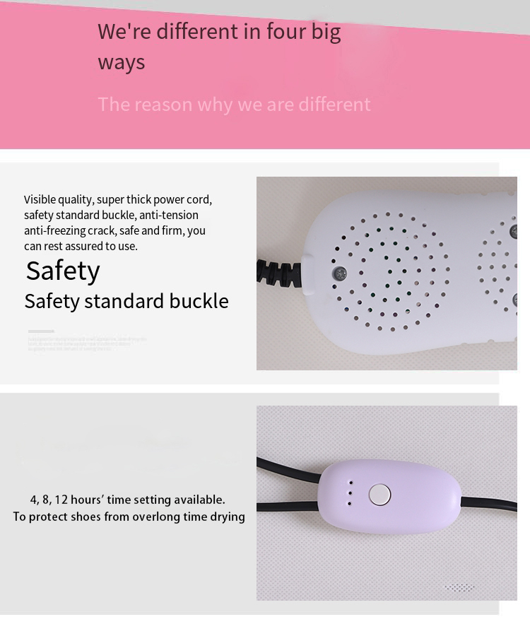 - ADJUSTABLE TIMER (time controller one): 4, 8, 12 hours’ time setting available. To protect shoes from overlong time drying.