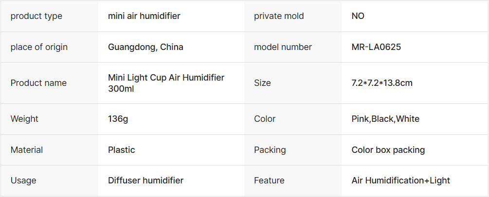 | Product name | Mini Light Cup Air Humidifier 300ml |