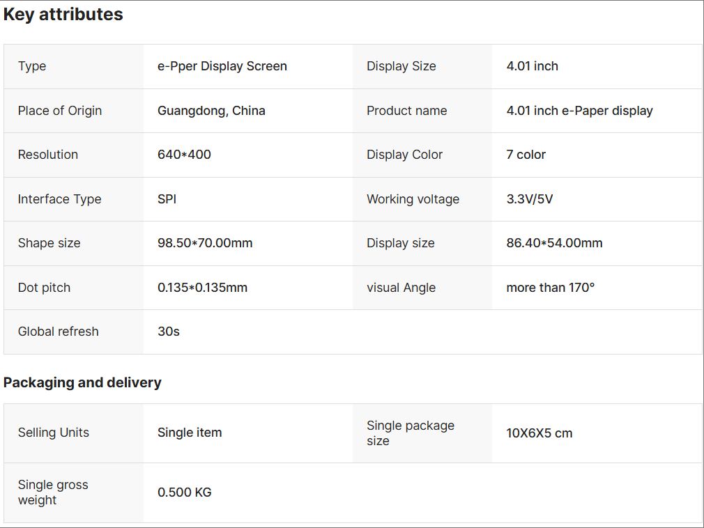 4.01 Inch e-Paper Display 7 Color ACeP Display e-ink Screen Module 640*400 Pixels SPI Interface