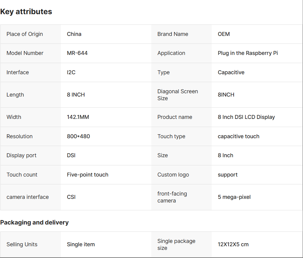 8 Inch DSI LCD Display Capacitive Touch Screen Monitor 800*480 Pixels 5-point Touch Display 5 Million Pixels Front Shot