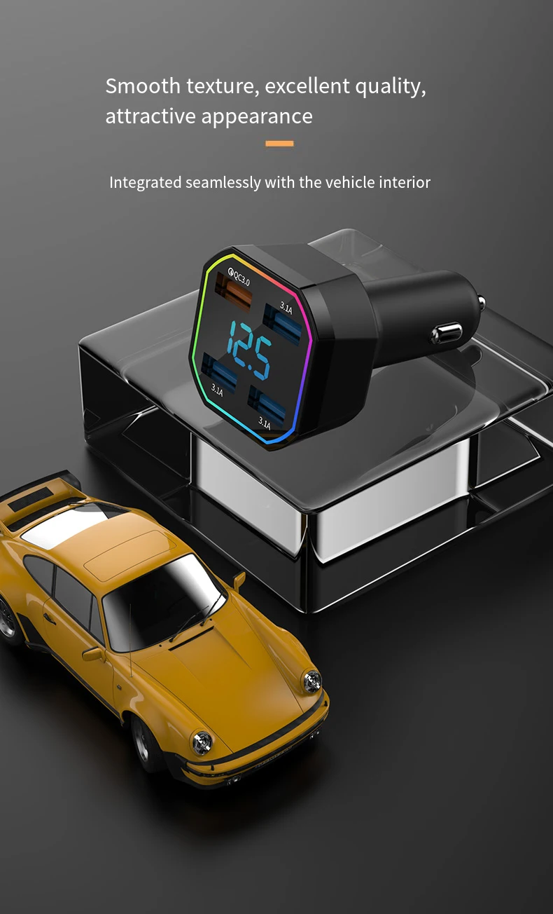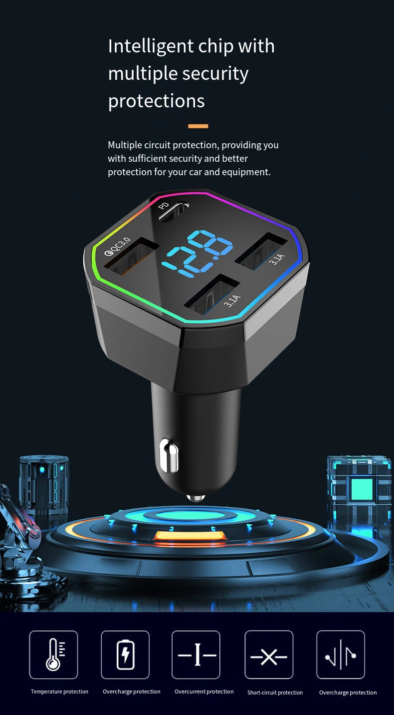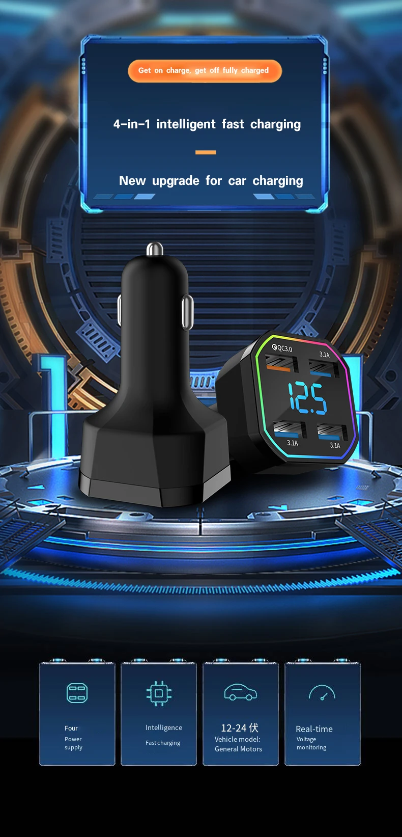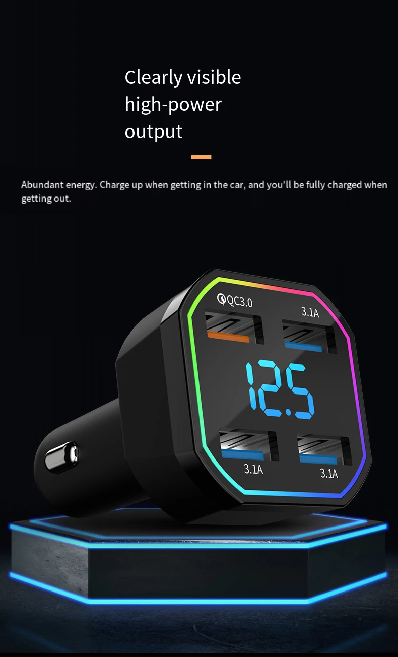 【Product Features】4-in-1 car charger. Fast charging four-port power supply, universal for all car models, LED digital display, real-time voltage detection, intelligent diversion, safe and fast, solid and non-slip, and strong vibration and bumps can continuously charge, strong compatibility, and more stable charging. 【Product Function】It has multiple protection functions such as overheating protection, overcharging protection, short circuit protection, overcurrent protection, etc., intelligent constant temperature heat dissipation, intelligent adjustment of output power, minimize thermal damage to the device, and provide users with the best and safer use experience.