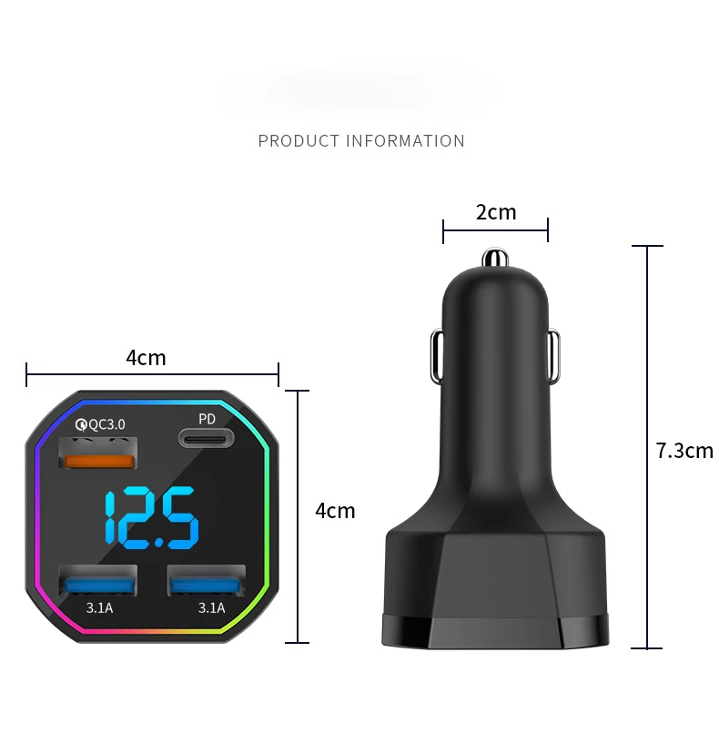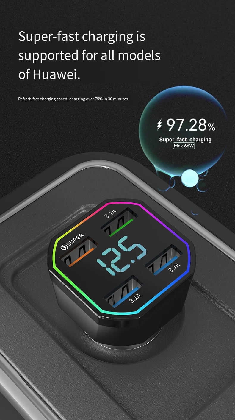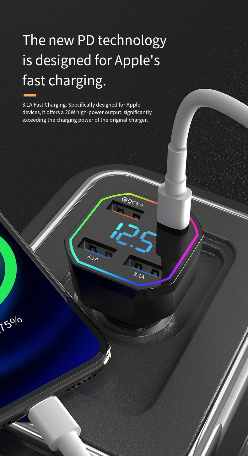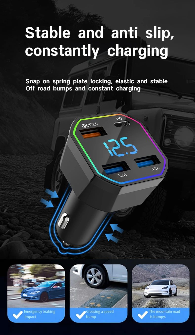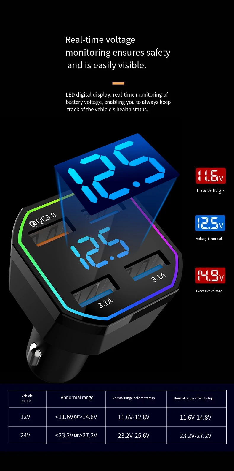 【Product Features】4-in-1 car charger. Fast charging four-port power supply, universal for all car models, LED digital display, real-time voltage detection, intelligent diversion, safe and fast, solid and non-slip, and strong vibration and bumps can continuously charge, strong compatibility, and more stable charging. 【Product Function】It has multiple protection functions such as overheating protection, overcharging protection, short circuit protection, overcurrent protection, etc., intelligent constant temperature heat dissipation, intelligent adjustment of output power, minimize thermal damage to the device, and provide users with the best and safer use experience.