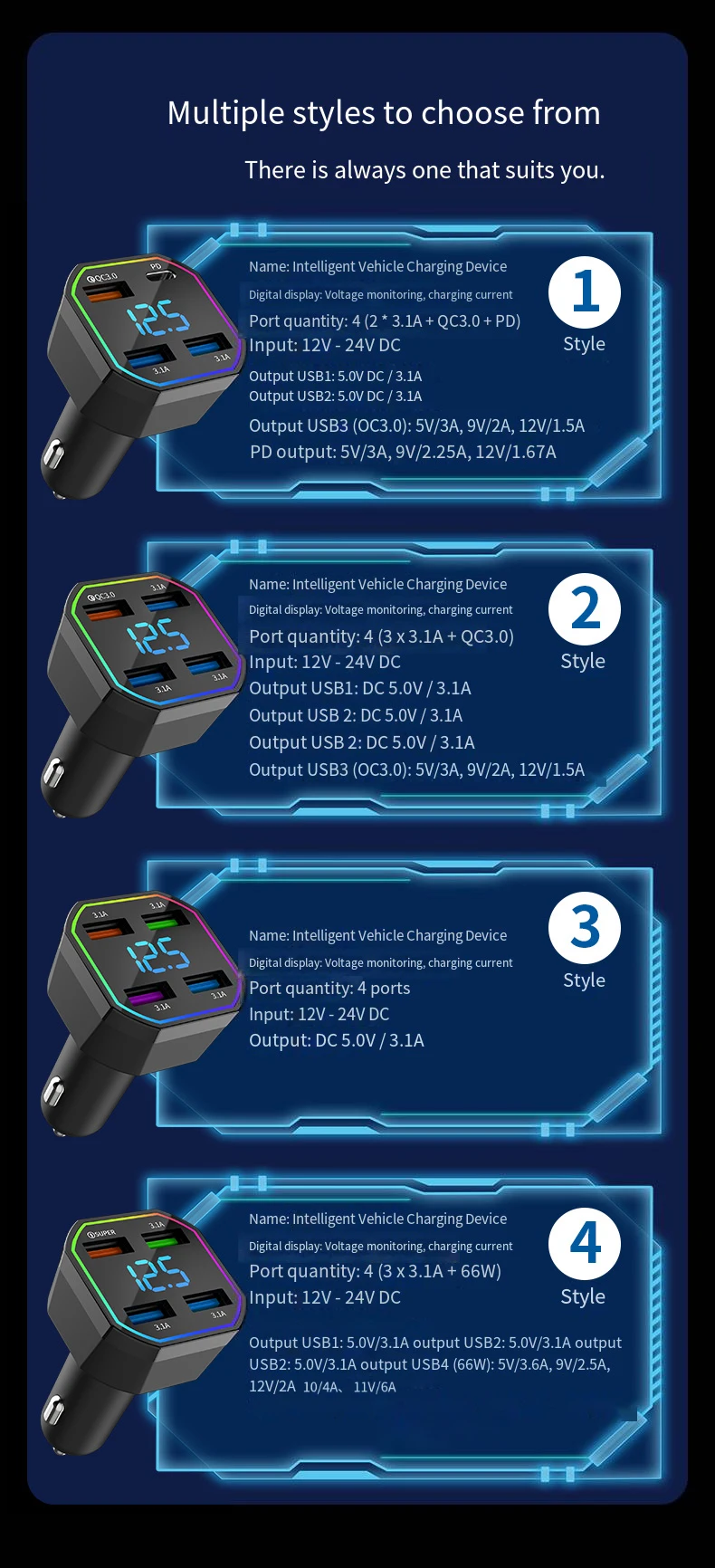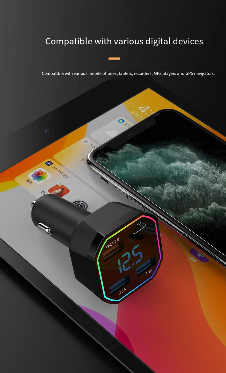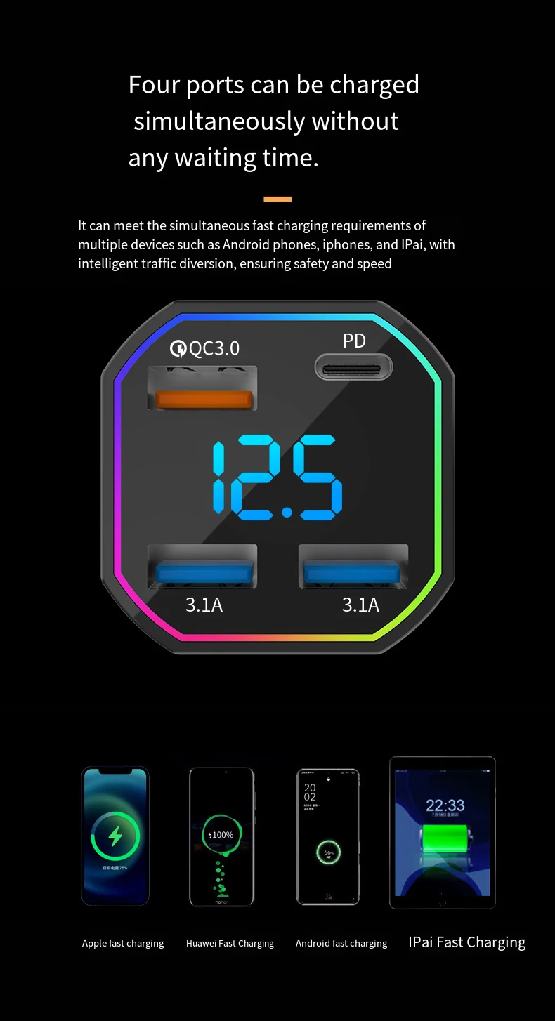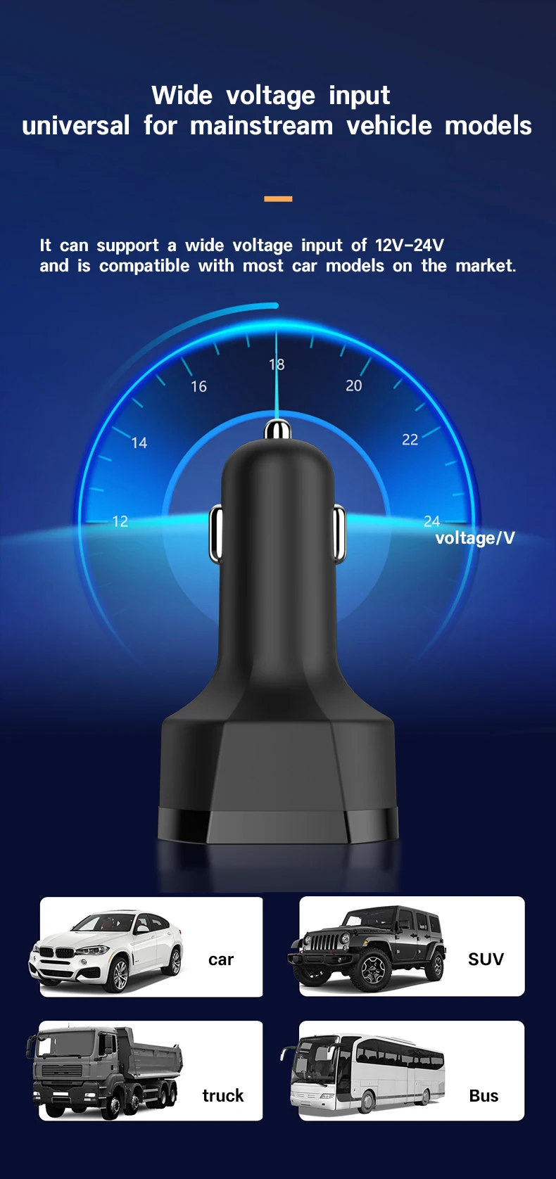 【Product Features】4-in-1 car charger. Fast charging four-port power supply, universal for all car models, LED digital display, real-time voltage detection, intelligent diversion, safe and fast, solid and non-slip, and strong vibration and bumps can continuously charge, strong compatibility, and more stable charging. 【Product Function】It has multiple protection functions such as overheating protection, overcharging protection, short circuit protection, overcurrent protection, etc., intelligent constant temperature heat dissipation, intelligent adjustment of output power, minimize thermal damage to the device, and provide users with the best and safer use experience.