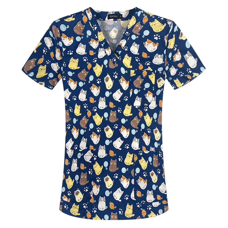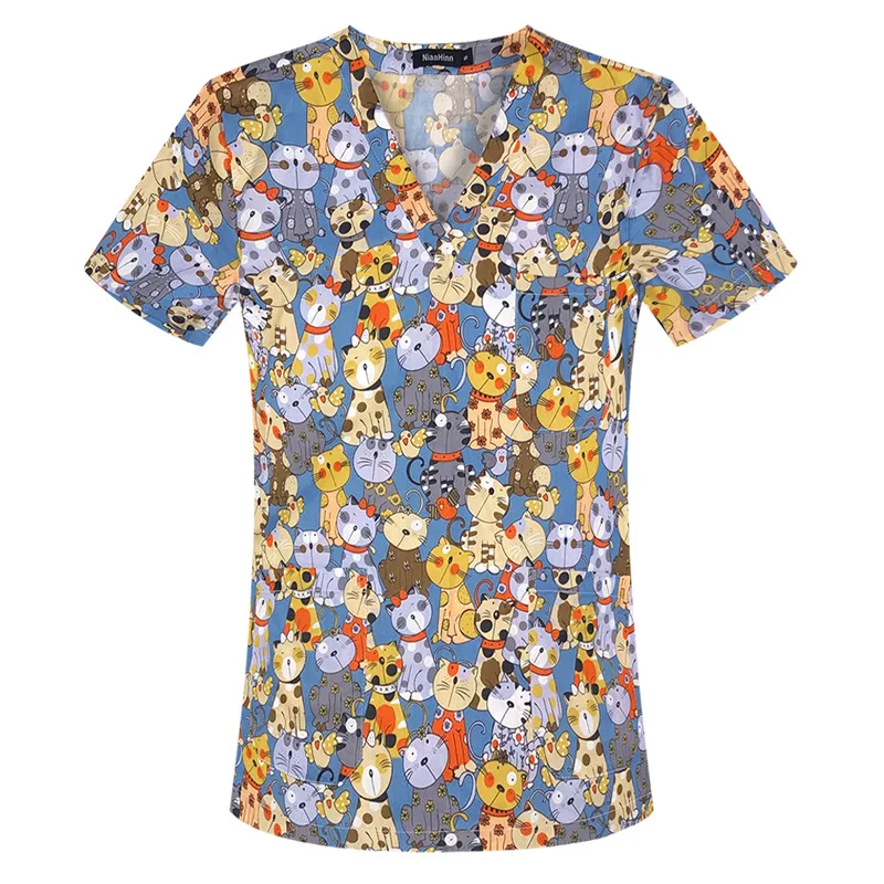 Hospital Nurse Uniform V-neck Floral Top Nursing Scrubs Unisex Cotton Work Clothes Short Sleeves Women Men Multicolour