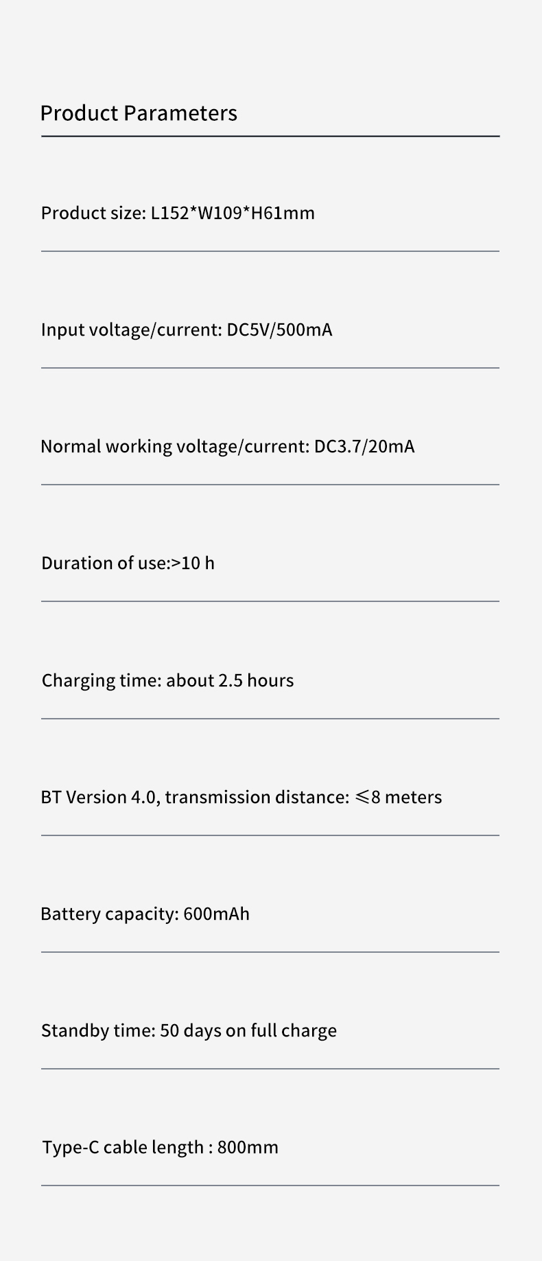 - 500mA Fast Charge : Achieves full charge in 2.5 hours via USB-C (DC5V input voltage compliant).
