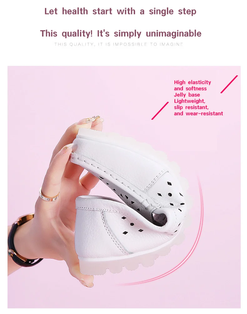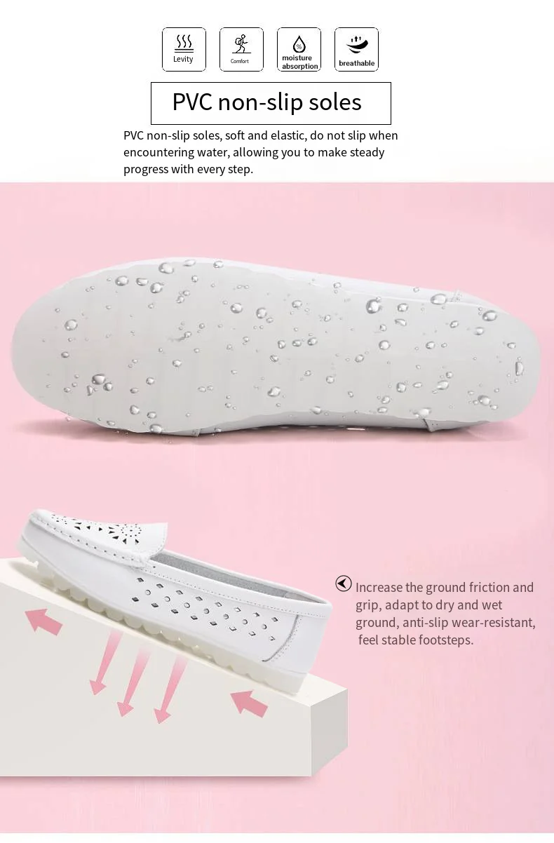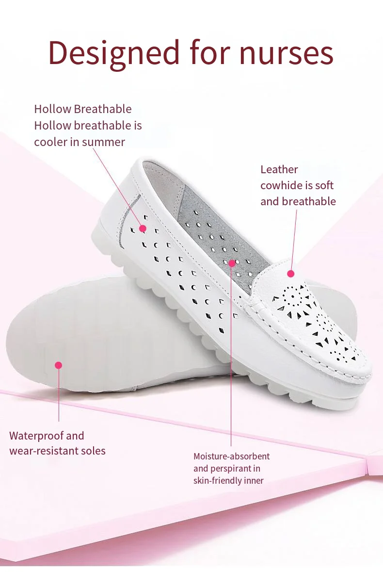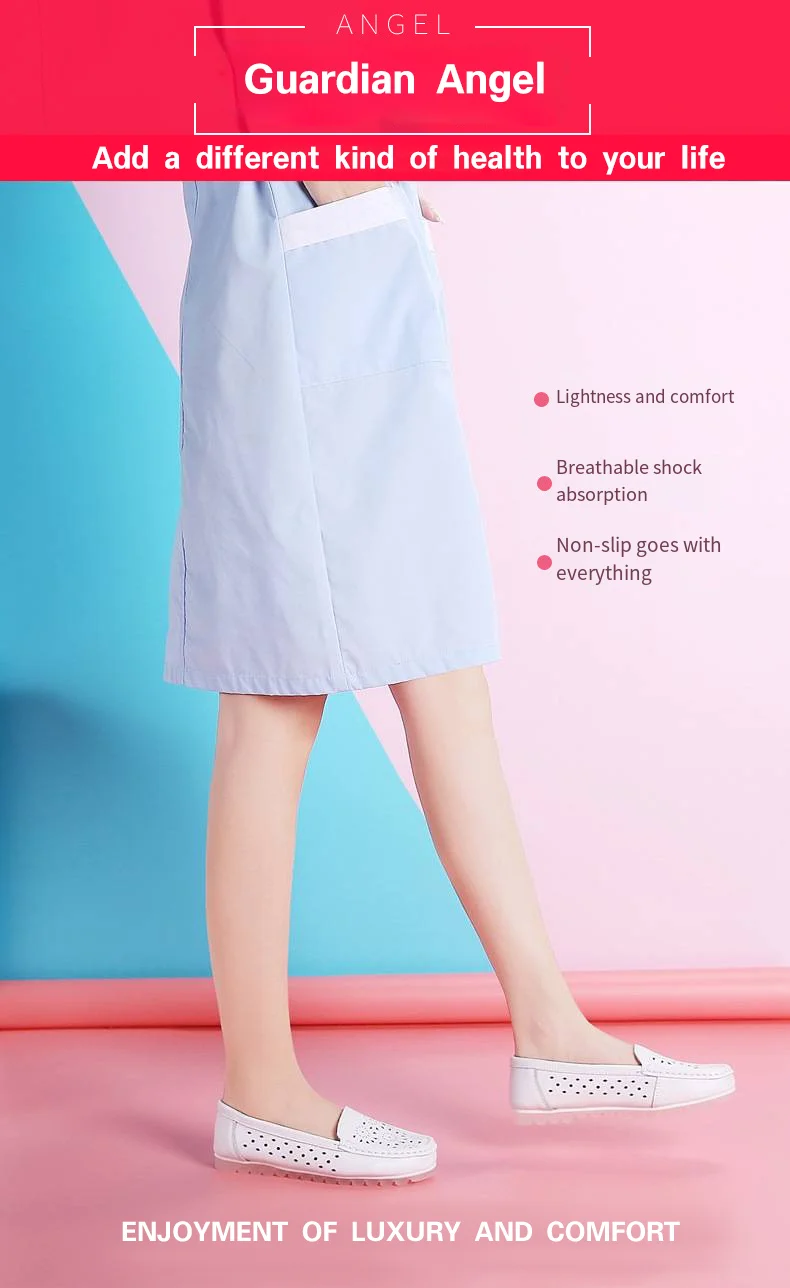 The shoes feature a hollow-out breathable design that enhances airflow, reducing heat build-up during extended shifts. Their upper crafted from second layer cowhide ensures durability without sacrificing flexibility. The flat heel design supports natural posture and balance, while the PVC sole includes specially engineered anti-slip tread patterns to maximize grip. This design approach addresses crucial workplace safety and comfort needs, marking these as top nurse shoes that adapt well to active healthcare duties.