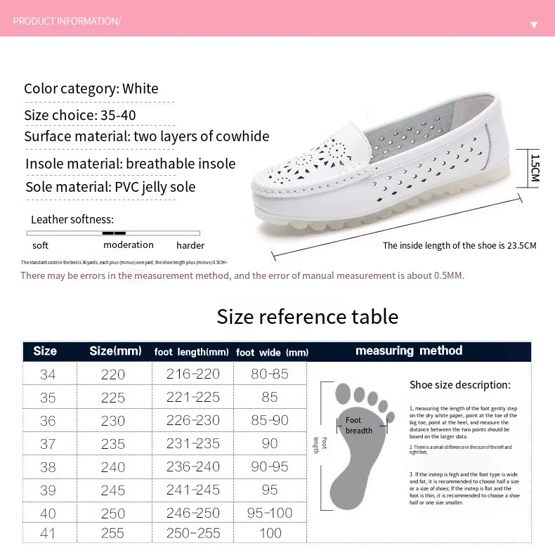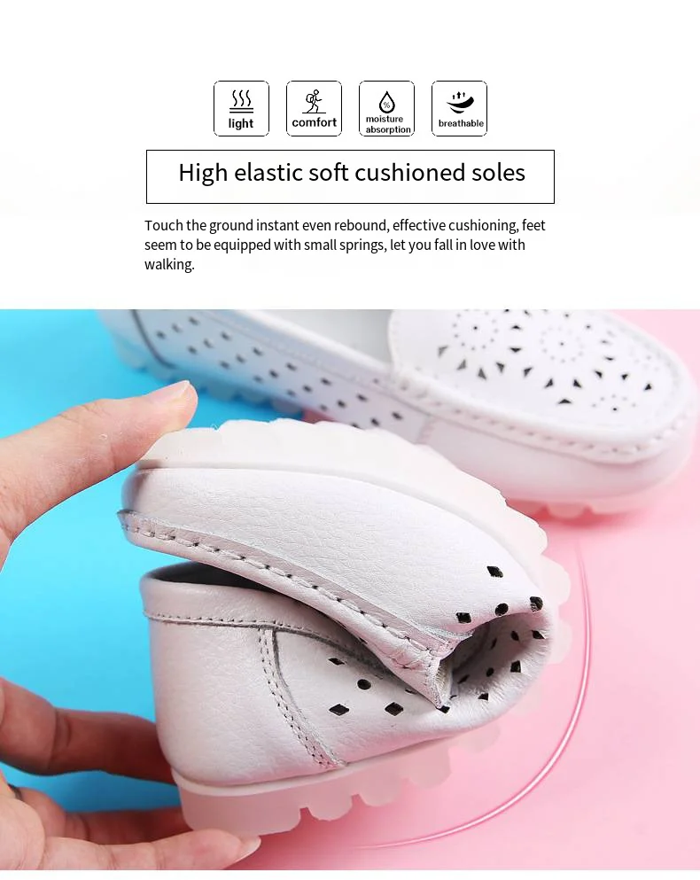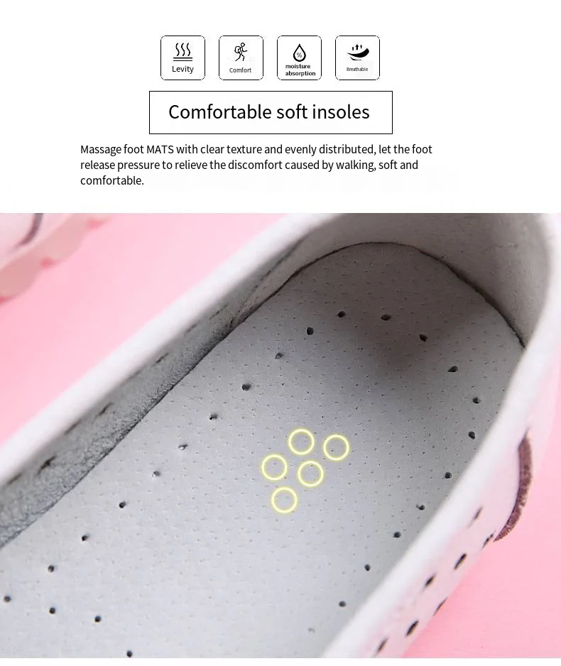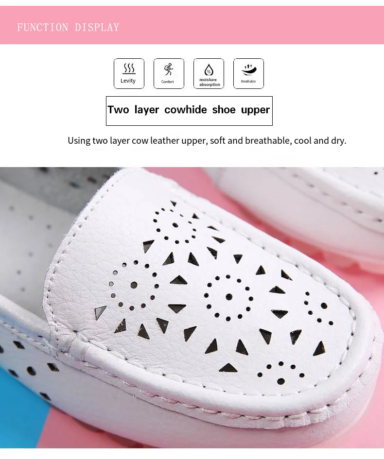 The shoes feature a hollow-out breathable design that enhances airflow, reducing heat build-up during extended shifts. Their upper crafted from second layer cowhide ensures durability without sacrificing flexibility. The flat heel design supports natural posture and balance, while the PVC sole includes specially engineered anti-slip tread patterns to maximize grip. This design approach addresses crucial workplace safety and comfort needs, marking these as top nurse shoes that adapt well to active healthcare duties.