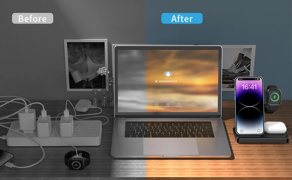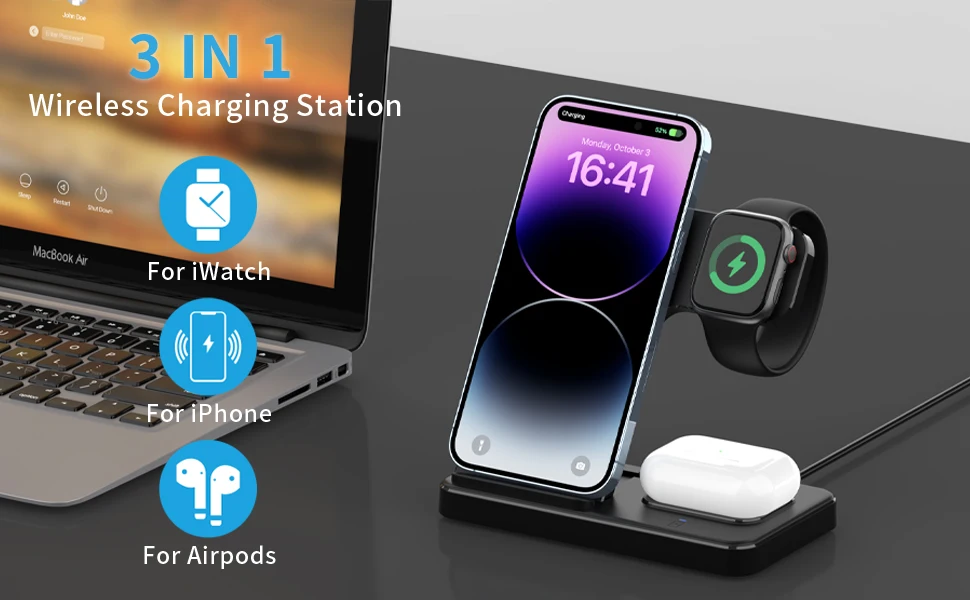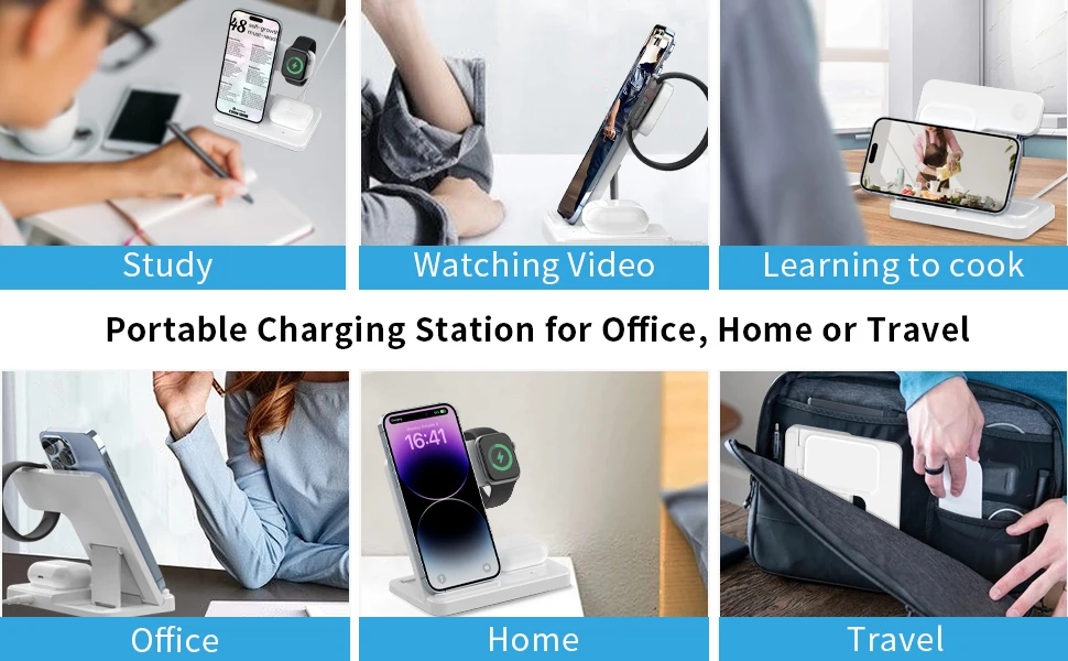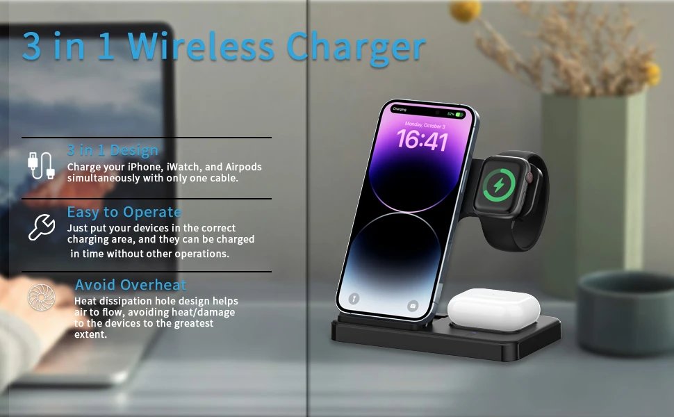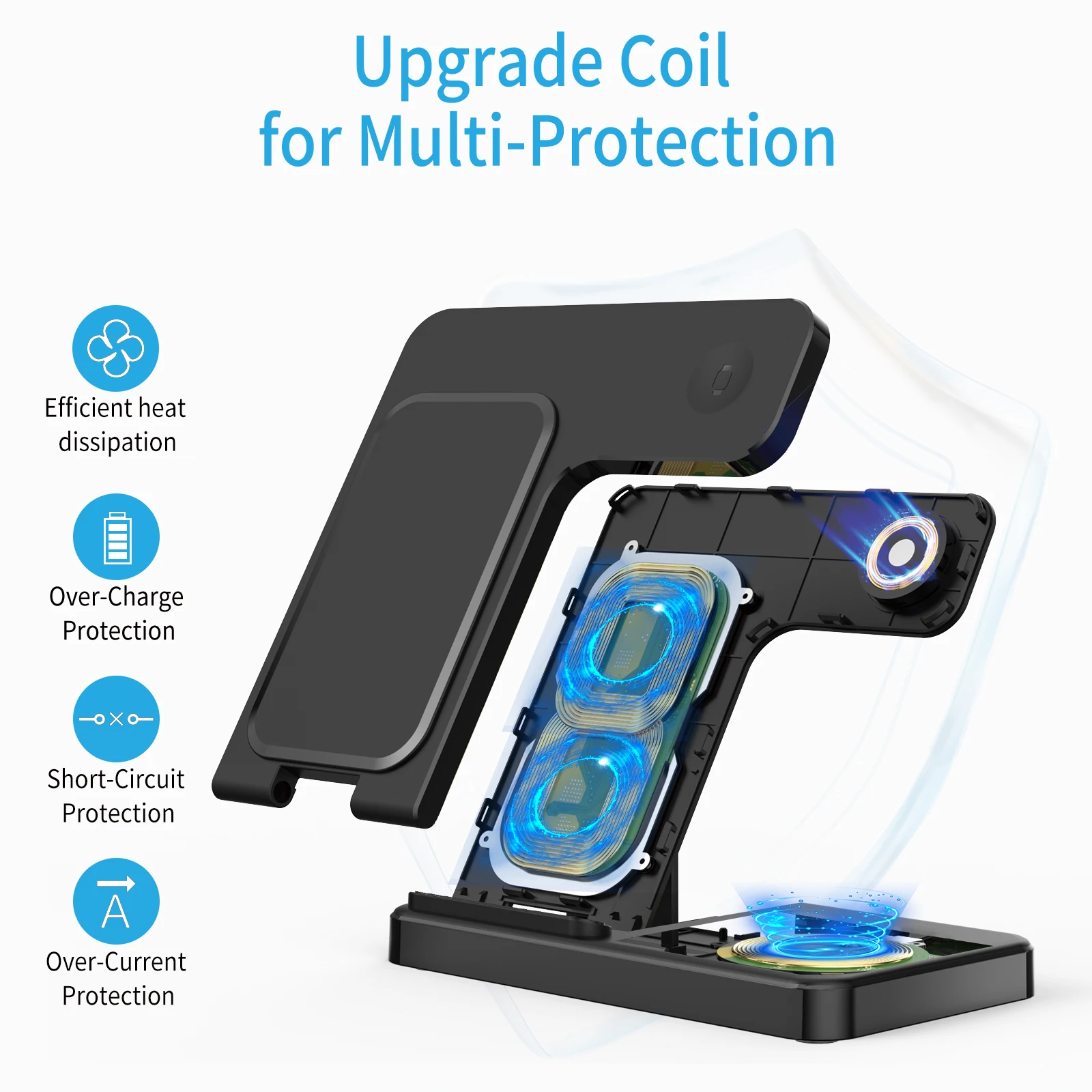【Product Features】3 in 1 wireless charging. Fast charging without heating, strong compatibility, more stable charging. The shell surface is sprayed with rubber oil, which is more textured and upscale. Breathing light prompt, and equipped with touch buttons and control light switch. Foldable design, smaller packaging volume.